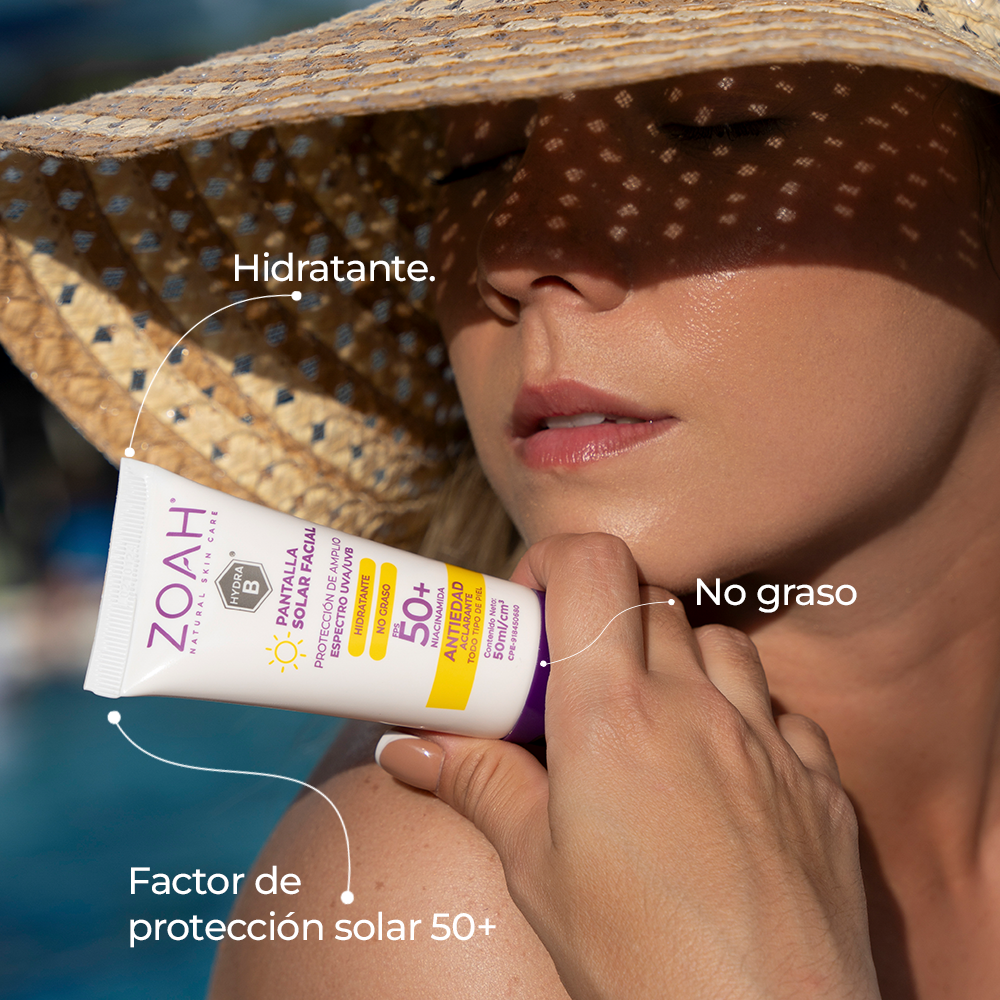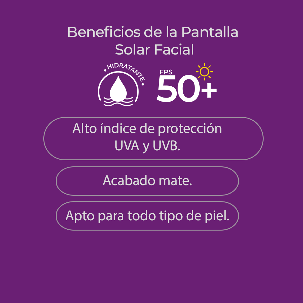 Protege la piel de tu rostro de los rayos UVA/UVB y Luz Azul, con nuestra Pantalla Solar Facial FPS 50+, formulada con Hydra B que mejora la estructura de la piel y previene la hiperpigmentación, suavizando y sin dejar efecto graso.